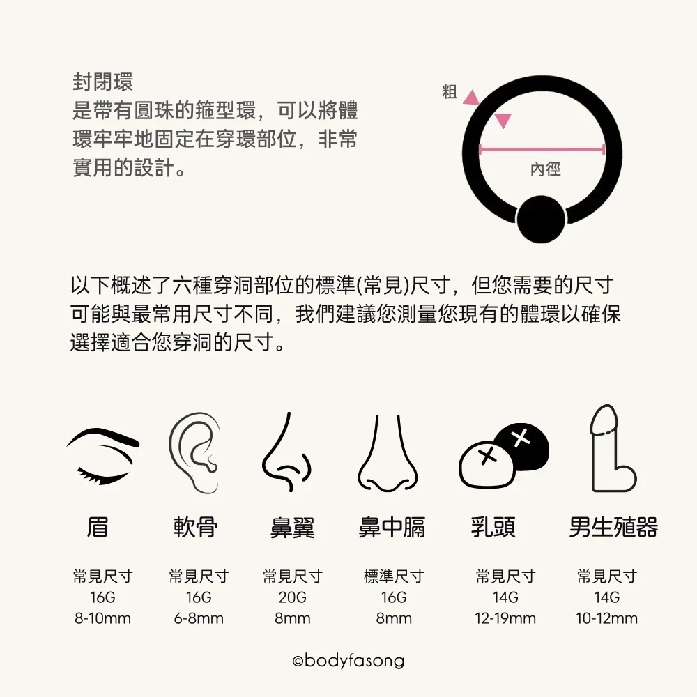 封閉環適用於眉環、耳環、鼻環、乳環以及生殖器穿環。
