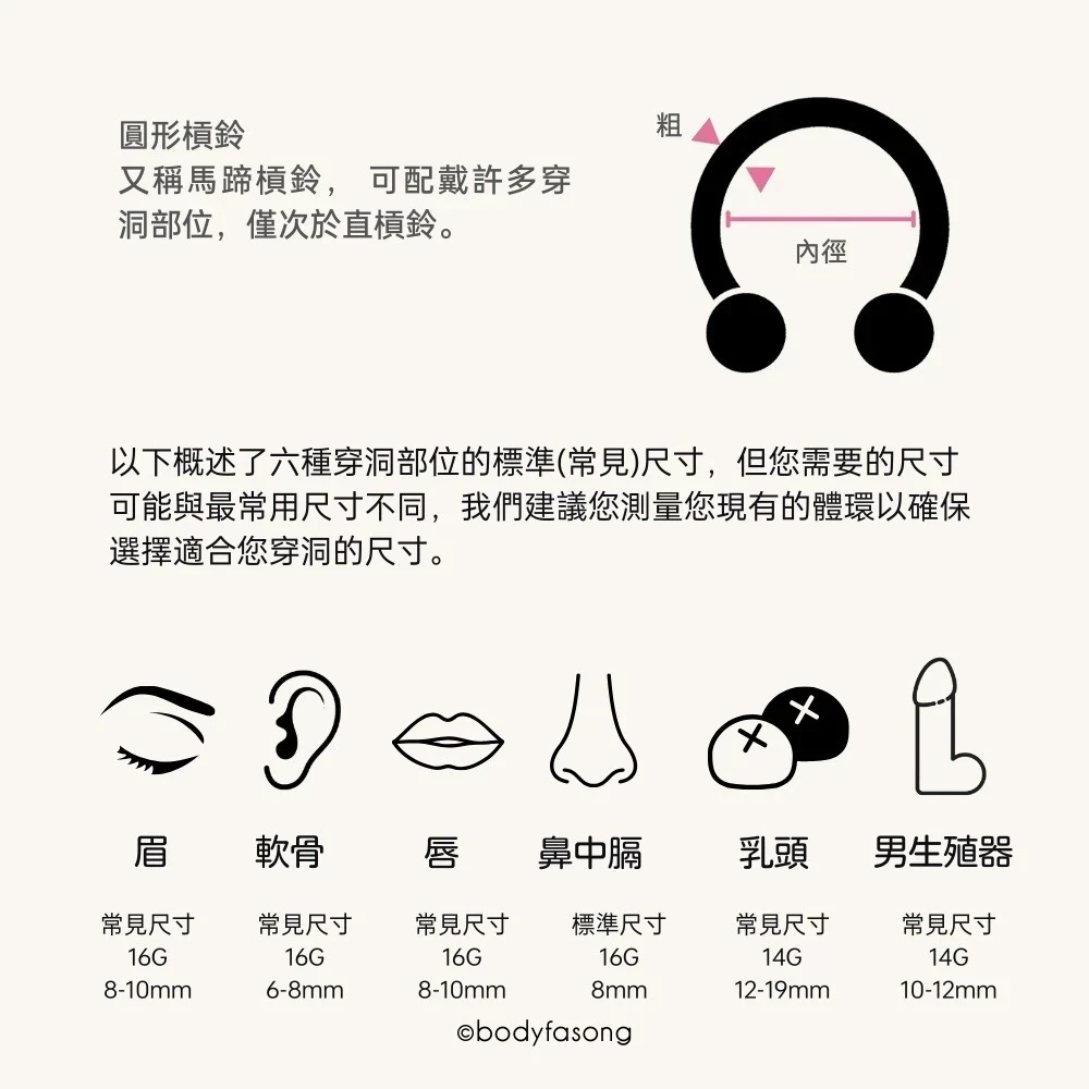 圓形槓鈴適用於眉環、耳環、唇環、鼻環、乳環以及生殖器穿環。