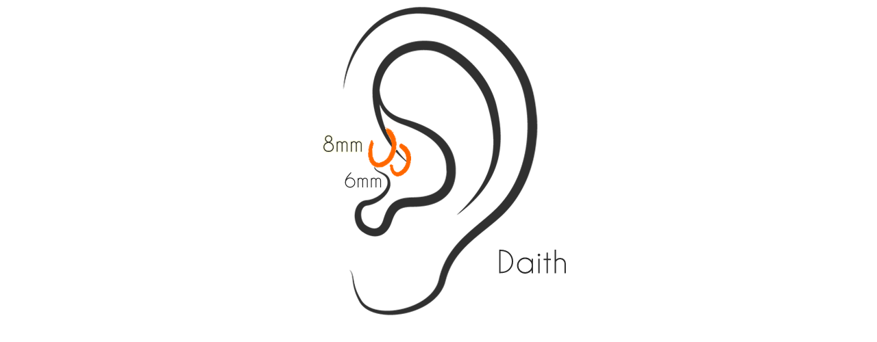 Daith穿耳,由穿環師Erik.Dakota與一位女客戶共同發明,由於必須從耳朵最裡面的軟耳作穿刺,因此需要彎曲的穿刺針。真正的Daith穿耳是環的底端像從耳孔中出來,如果能看到兩端,表示穿環師的技術拙劣。 癒合期:4至12個月。初穿尺寸:6mm -10mm