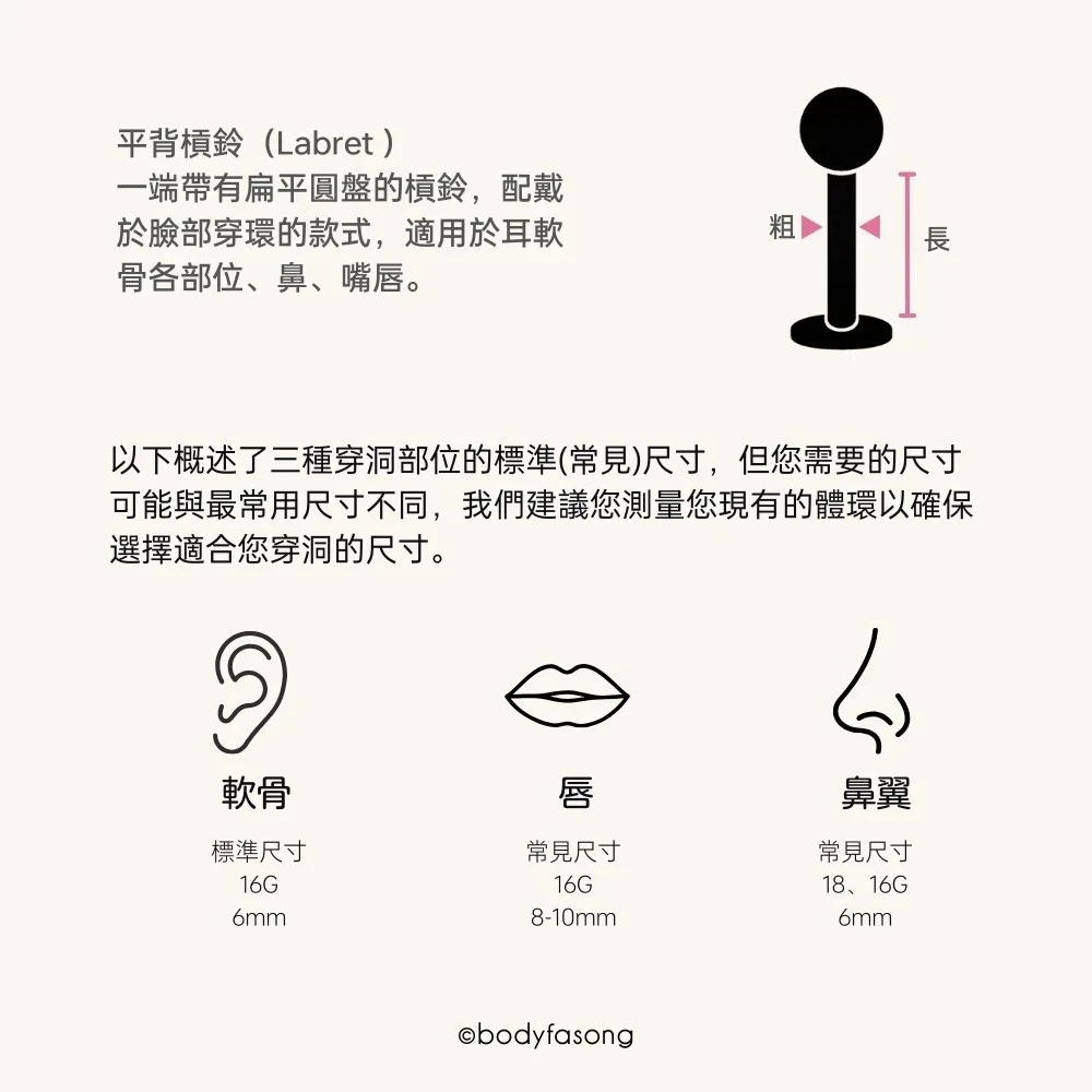 平背槓鈴(Labre)可使用在耳軟骨各部位,如:海螺耳洞(耳窩)、軟骨、耳垂,以及側鼻環(鼻翼)、唇釘。