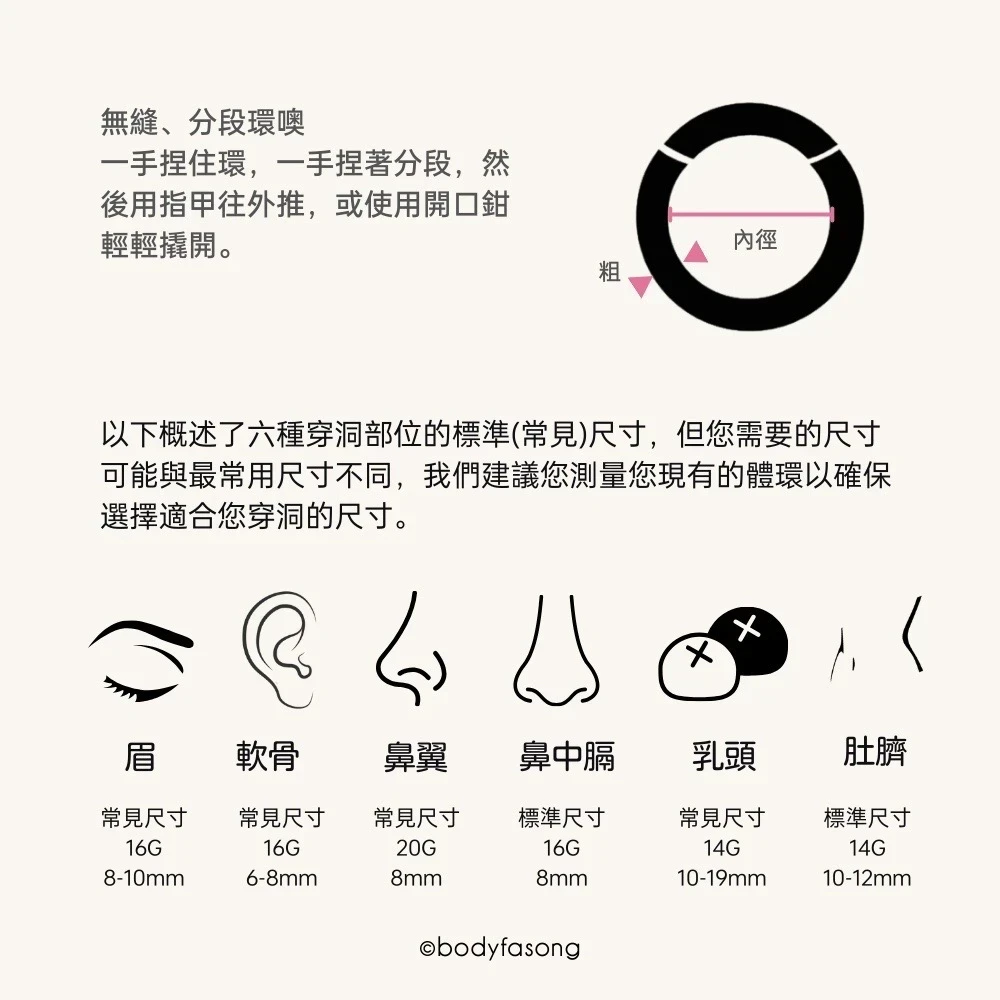 無縫環、分段環適用於眉環、耳環、鼻環、乳環以及肚臍環。