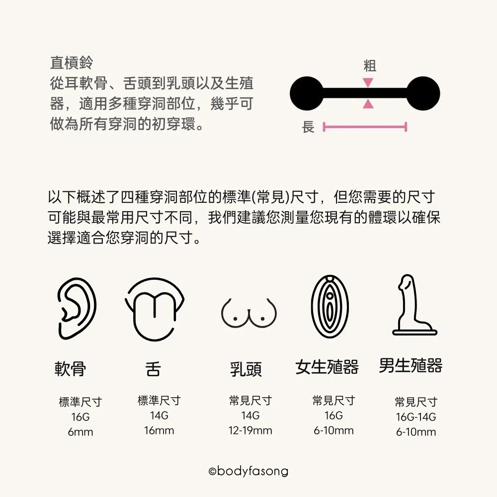 直槓鈴適用多種穿洞部位,從耳軟骨、舌頭到乳頭、生殖器,有多種尺寸可供選擇,同時提供各種大小轉珠,讓您輕鬆找到適合自己的尺寸。